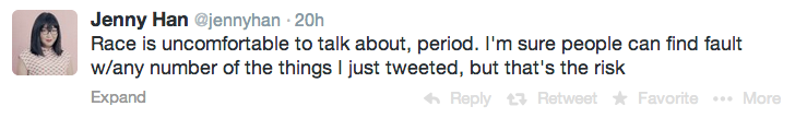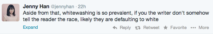 Brace yourselves. Here’s another blog post on the lack of diversity in YA. When we bring up these topics the common words I see are FEAR, UNCOMFORTABLE, GUILT.  If a white person brings up the subject then, “who are they to talk about it?” If a POC does it, we’ll be seen as a bunch of angry people. So, Catch 22. I get it. Writing these posts is HARD, but they should be written. Recently one of my favorite authors ever, Jenny Han, tweeted about diversity in YA. The thing is, we need to feel uncomfortable, and like Jenny said, “that’s the risk.”