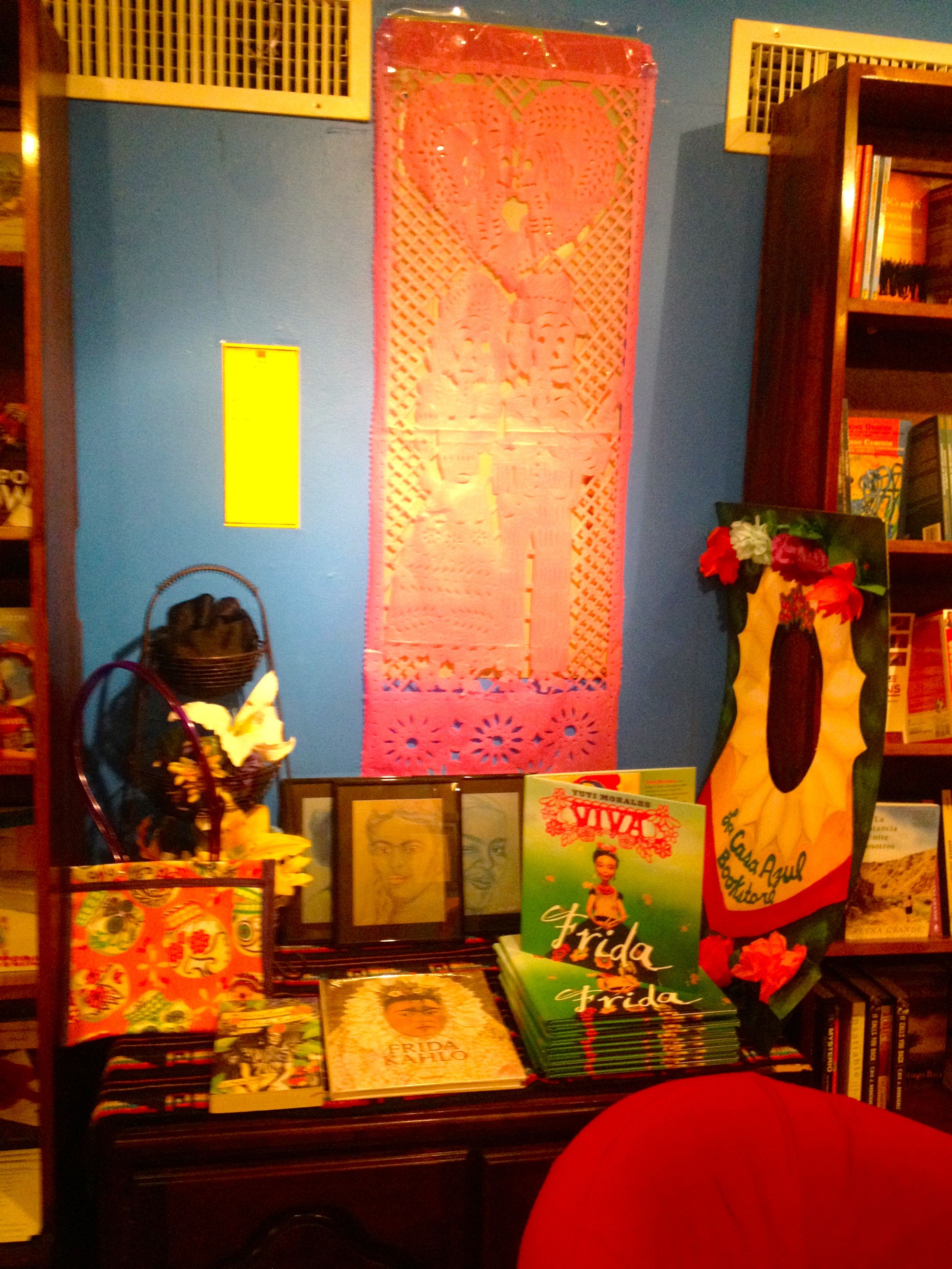 Once inside, the bookstore is warm and inviting. Aurora Anaya-Cerda is there with another employee stacking books. Named and inspired by Frida Khalo’s home, La Casa Azul has many references to her that range from paintings, to art books, to art installations. LCA even has its own exhibit/gallery. Their current showcase is called “A Ribbon Around a Bomb,” by Suhaly Bautista, The Earth Warrior. I’m excited to see what the next art display will be.