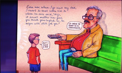 You might wonder why I, as a trained literary scholar in this field, decided to do something for which I had no training at all? Interestingly, it was only after I started doing cartoon sketches about my undocumented heritage that that the conversation that I wanted to get started actually occurred. What changed? Why did it my cartoons elicit a reaction that my scholarship did not? I think that the main reason my cartoons hit the nerve that my essays and stories could not do had everything to do with the form. As the saying goes, “a picture is worth a thousand words.” Here, I was creating visual essays, communicating the same ideas I had been researching, with the cartoons I was crafting. I realized that the young people who responded to my cartoons were also more accustomed to consuming visual text. Snapchat, Facebook, emojis, all of these had developed in them literacy skills for quickly digesting ideas in images.