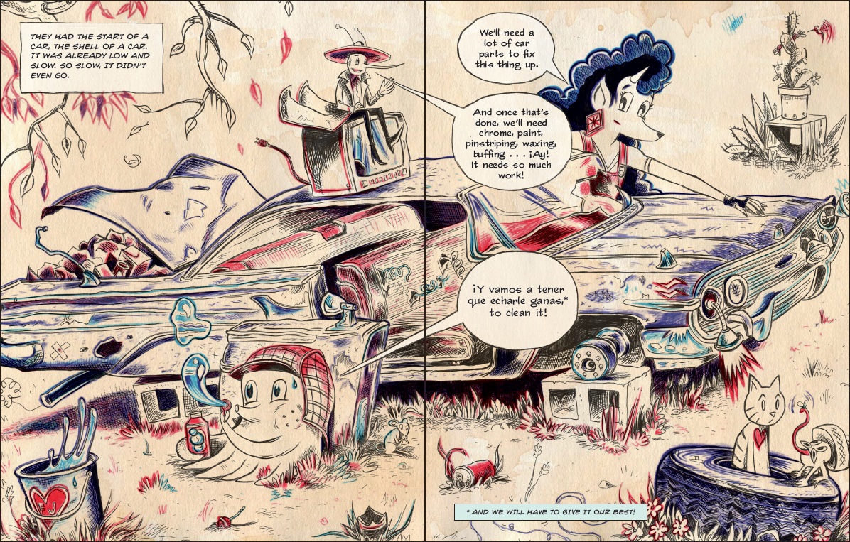 Just as Raúl was able to make contributions to the text, I sometimes added context to the drawings. For example, it was important to me that our lowriders’ car had the Big Dipper on it. For the lowrider diaspora of Latinos and African Americans whom the book celebrates, the Big Dipper represents the path north, and more broadly, the path to freedom. What better symbol to have on a flying car’s license plate? Our book celebrates the influence of older comics, art, pop culture and car references that Raúl and I both love and wanted to share, including George Herriman’s Krazy Kat, the Hernandez Brothers’ Love and Rockets, Mad Magazine and Big Daddy Roth’s cars.